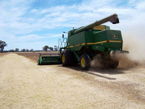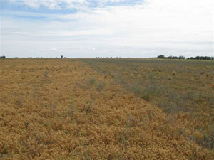The medic ph gene stops the maturing medic pod from dropping off the plant, so that it can be harvested from the fully mature plant with an ordinary header pretty much like any ordinary crop (see pictures below left). In all normal (non-ph) medics, pods drop off the plant as they approach maturity, so that the only feasible way of harvesting them to get seed is by vacuuming up the pods off the ground. This is an incredibly expensive, time consuming and difficult process that requires both specialist equipment and a lot of fuel.