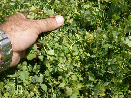 - Mature pod held on plant; can be readily harvested with an ordinary header for cheap, high quality seed and used on-farm to generate high yield, high quality pasture whenever needed.