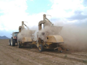 The medic ph gene stops the maturing medic pod from dropping off the plant, so that it can be harvested from the fully mature plant with an ordinary header pretty much like any ordinary crop (see pictures below left). In all normal (non-ph) medics, pods drop off the plant as they approach maturity, so that the only feasible way of harvesting them to get seed is by vacuuming up the pods off the ground. This is an incredibly expensive, time consuming and difficult process that requires both specialist equipment and a lot of fuel.